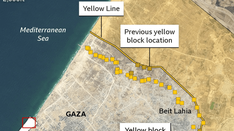 Sesuai kesepakatan gencatan senjata yang dimediasi Amerika Serikat dengan Hamas, Israel seharusnya menarik pasukannya ke belakang Yellow Line, sebagaimana ditunjukkan dalam peta militer Israel. Garis itu kemudian ditandai di lapangan menggunakan blok beton kuning sebagai batas fisik.