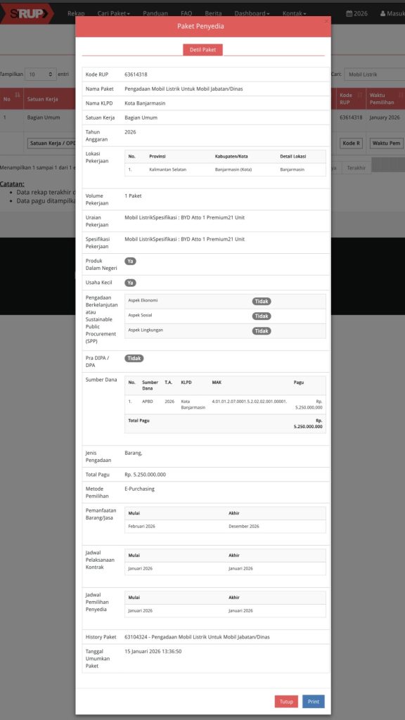 Paket dengan kode RUP 63614318 itu dilengkapi keterangan pagu Rp5.250.000.000 bersumber dari APBD 2026. Itu artinya, per unit mobil bernilai Rp250 juta.