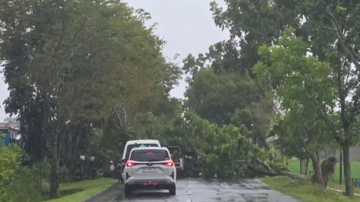 Sebatang pohon berukuran besar tumbang dan menutup seluruh badan jalan.