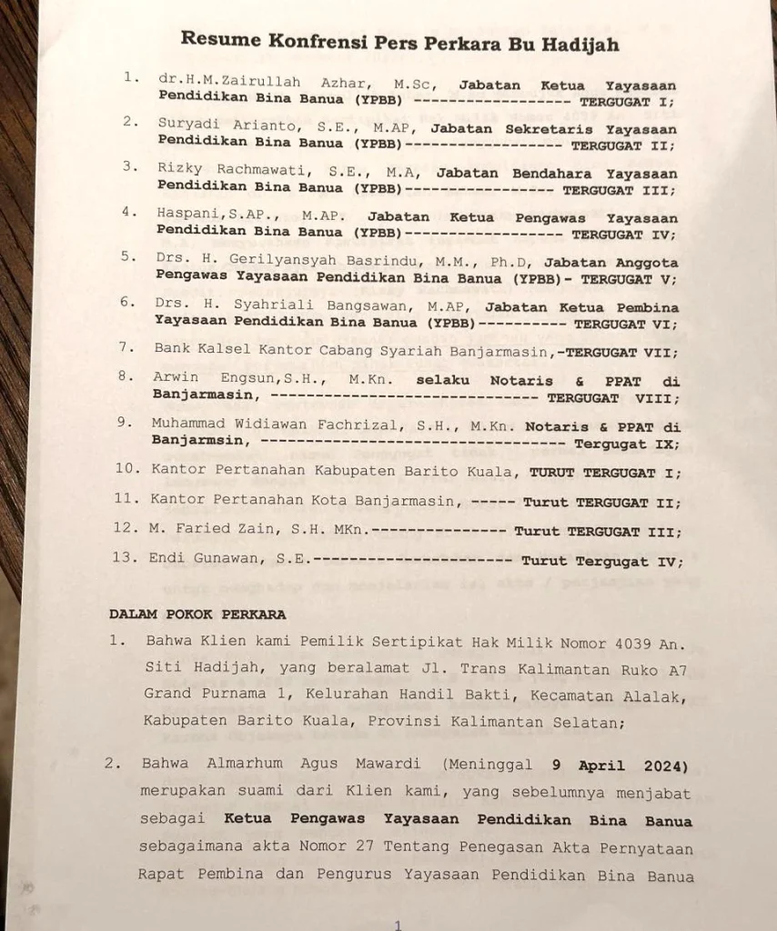 Dalam perkara bernomor register tersebut, Siti Hadijah tidak hanya menggugat Zairullah, tetapi juga jajaran pengurus yayasan, oknum notaris, PPAT, hingga kantor pertanahan di Banjarmasin dan Barito Kuala. Secara total, terdapat 13 pihak yang terseret dalam pusaran hukum ini.