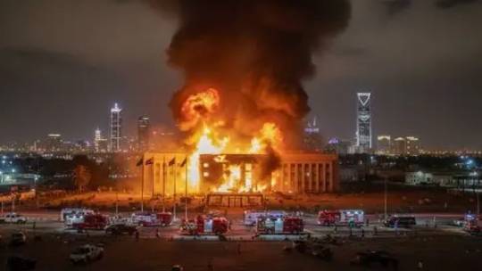 Kantor berita Reuters melaporkan asap hitam terlihat membumbung di atas Kawasan Diplomatik Riyadh, tempat berbagai perwakilan asing berkantor. Tiga saksi mata mengaku mendengar ledakan keras sebelum melihat kobaran api dari arah kompleks kedutaan.