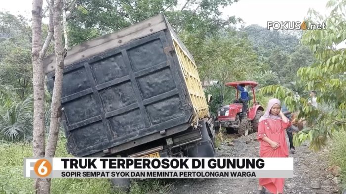 Truk kemudian terperosok di sisi kiri badan jalan yang dipenuhi bebatuan. Sopir yang panik langsung berjalan menuju kampung terdekat untuk meminta bantuan warga.