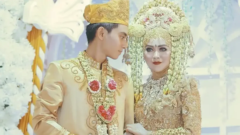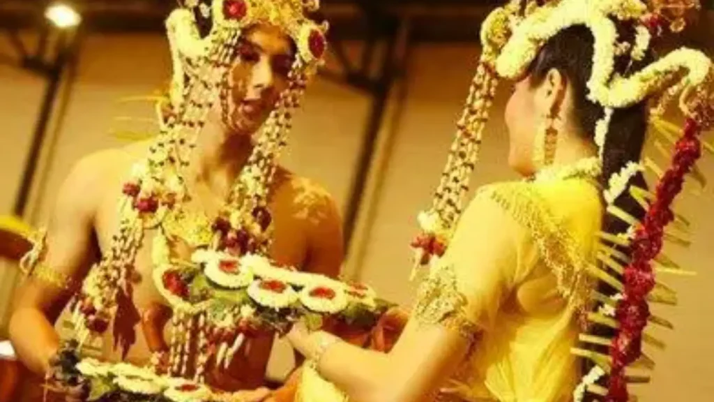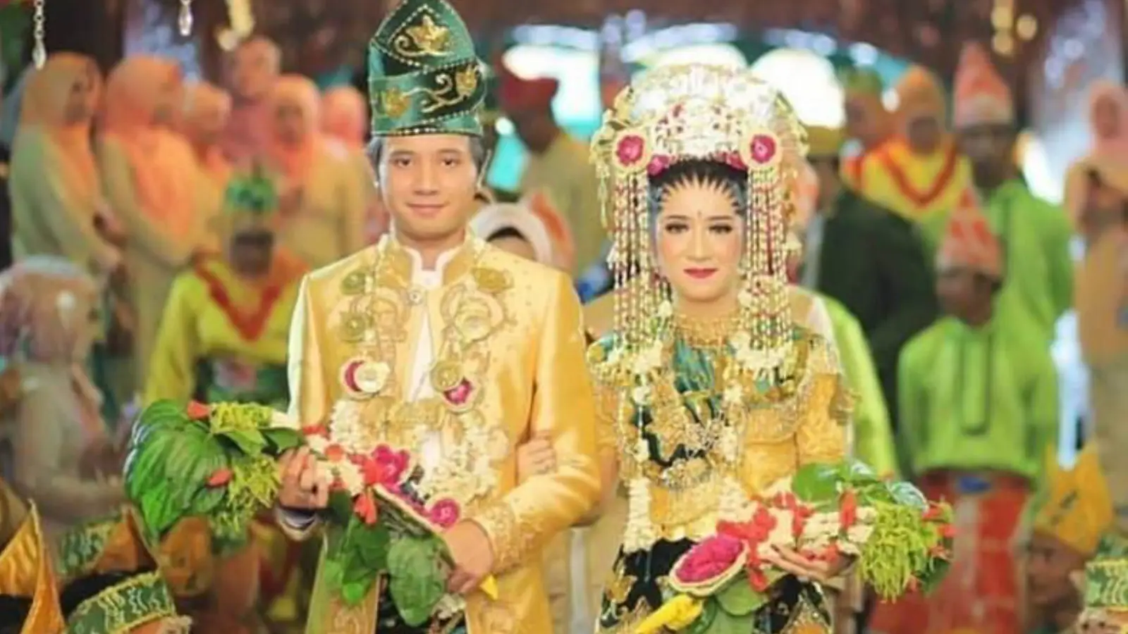 Pengantin wanita mengenakan gaun berhias payet, ikat pinggang, dan mahkota rangkaian melati, mawar, dan clematis. Sementara itu pengantin pria tampil bertelanjang dada dengan celana sebatas betis dan kalung samban.