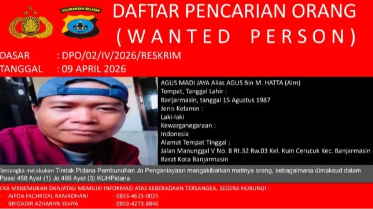 fokus6.net, BANJARMASIN — Polisi memburu pelaku pembunuhan yang terjadi di kawasan Kuin Cerucuk, Banjarmasin Barat. Hingga kini, terduga pelaku Agus Madi Jaya alias Agus (39) belum berhasil ditangkap dan telah resmi masuk dalam daftar pencarian orang (DPO).